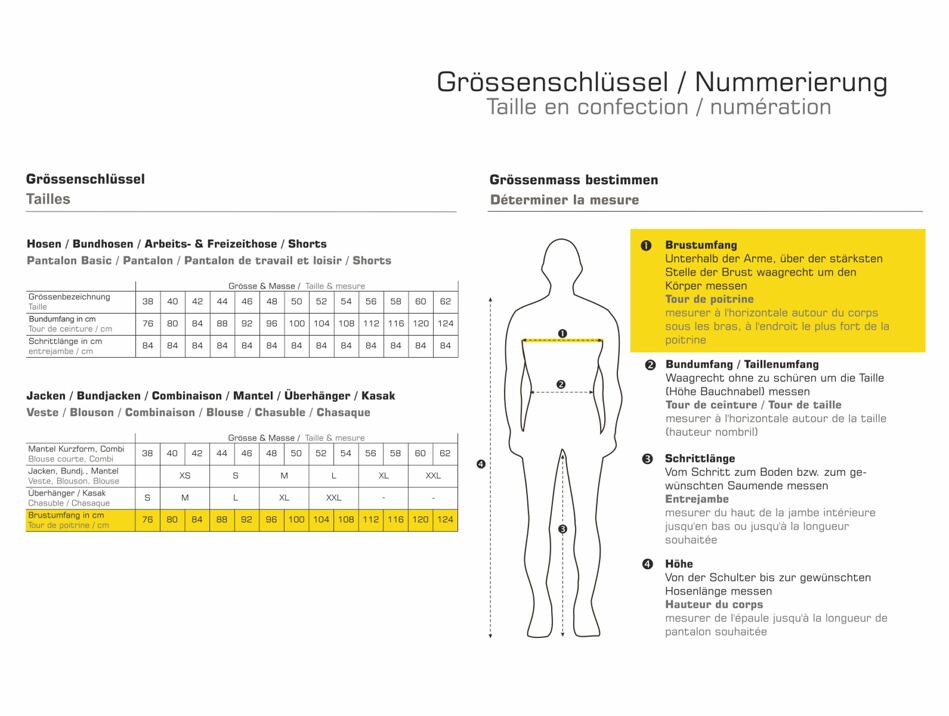 Grössentabelle Arbeitsjacken / Tableau des tailles pour les vestes de travail